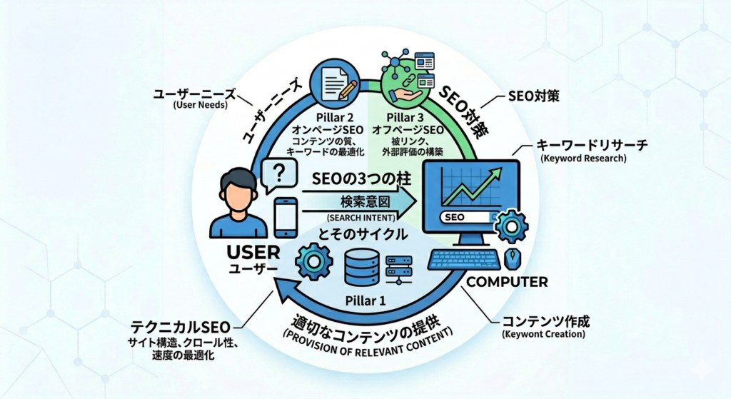 検索エンジン(主にGoogle)は、独自のアルゴリズムを用いてウェブサイトを評価しています。その評価基準は、大きく以下の3つの要素に集約されます。