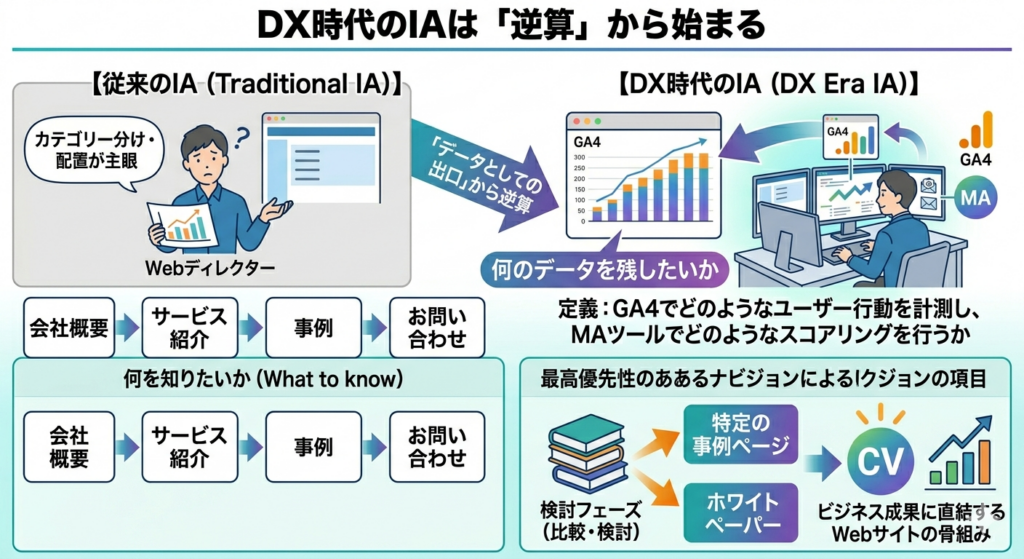 従来のIA(情報設計)は、サイト内の情報をカテゴリー分けし、ユーザーが迷わないように配置することに主眼が置かれてきました。しかし、DX時代のIAに求められるのは**「データとしての出口」**から逆算することです。