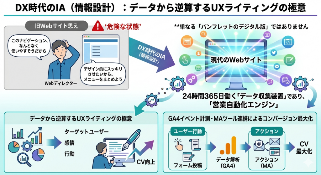 現代のWebサイトは、単なる「パンフレットのデジタル版」ではありません。**24時間365日働く「データ収集装置」であり、「営業自動化エンジン」**です。本記事では、GA4のイベント計測やMAツールとの連携を前提とした、コンバージョンを最大化させるための実戦的IA手法を解説します。