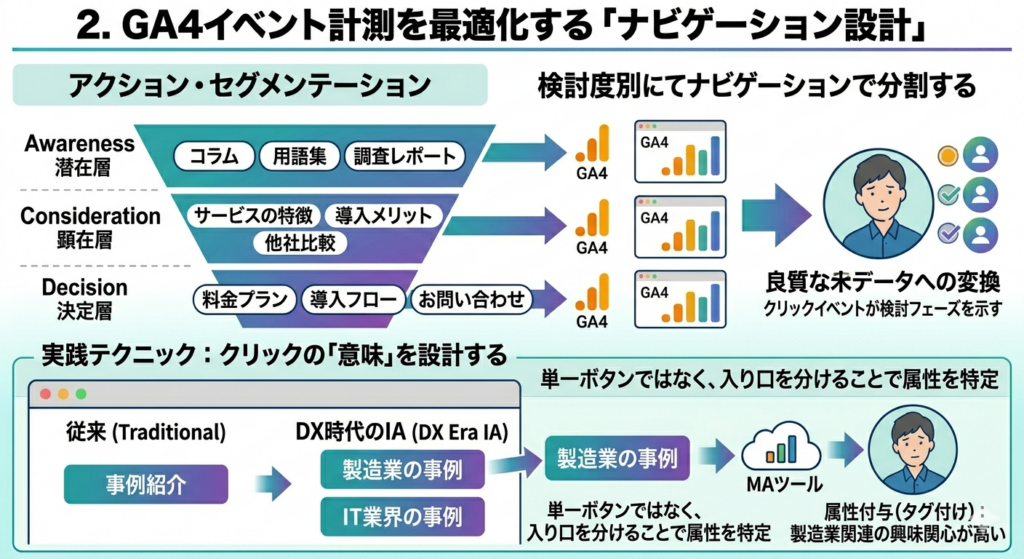 このようにIAを設計することで、ユーザーがどのメニューをクリックしたかという「イベント」が、そのまま**「そのユーザーがいま、どの検討フェーズにいるか」という良質なデータ**に変換されます。